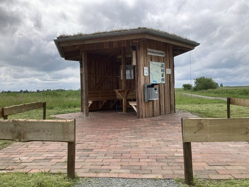 Im Außenbereich der Gemeinde Drage auf halbem Wege zur Kanueinsatz- und Badestelle sowie zur Schleuse Nordfeld soll eine attraktive Schutzhütte gebaut werden. Der Standort liegt an mehreren ausgeschilderten Fahrrad- und Wanderwegen innerhalb der Eider-Treene-Sorge-Region. Die Schutzhütte mit Gründach und weitem Dachüberstand hat an den geschlossenen Seiten fest installierte Sitzbänke sowie eine Abstellfläche. An der westlich gelegenen Seite werden zwei Luken in verschiedenen Höhen eingebaut, die im geöffneten Zustand die Beobachtung von Wiesenvögeln ermöglichen. Unter dem Dachüberstand werden verschiedene Nisthilfen aus widerstandsfähigem Holzbeton montiert sowie Brutröhren für Wildbienen und weiteren Insektenarten. Ein Angebot für Fledermäuse und Nestbretter für Rauch- und Mehlschwalben ergänzen die Ausstattung. Infotafeln vervollständigen das Vorhaben.